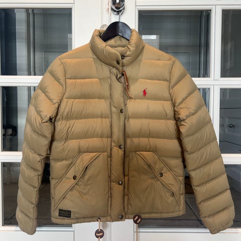 Ralph Lauren Annet yttertøy for dame i størrelse L. Jakken er blå og laget av dun. Den har hette med pelskant og glidelåslukking med trykknapper. Jakken er designet for å gi varme og komfort i kaldt vær.
