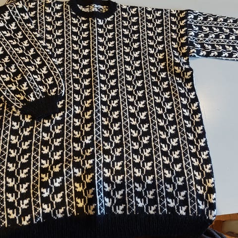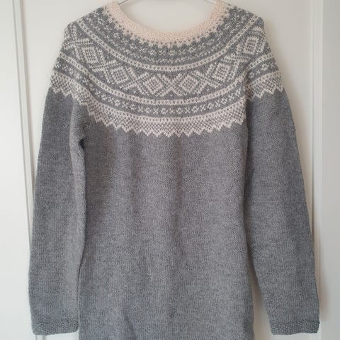 Hjemmestrikket ullgenser strikket av 1 tråd Rauma Tumi igjen 1 tråd Sandnes Tynn Silk Mohair. Veldig behagelig. Genseren har splitt i sidene. Passer like godt til bukse som til kjole/skjørt.
