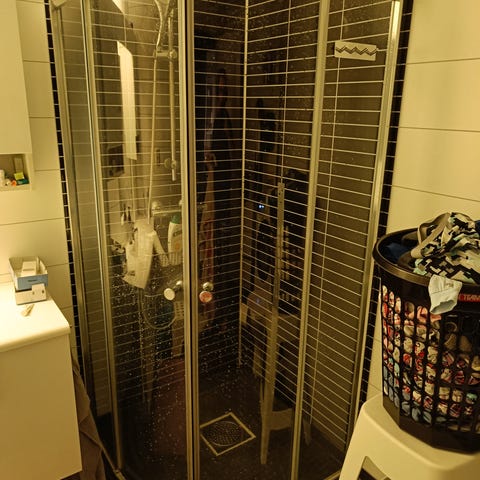 Baderomsinnredning med servant, speil og skap, samt dusjkabinett med glassdører.