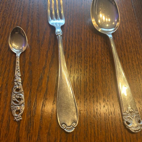 15 deler bestikksett i sølvplett. De er ikke brukt, men trenger en rens etter å ha lagt i skuffen en stund