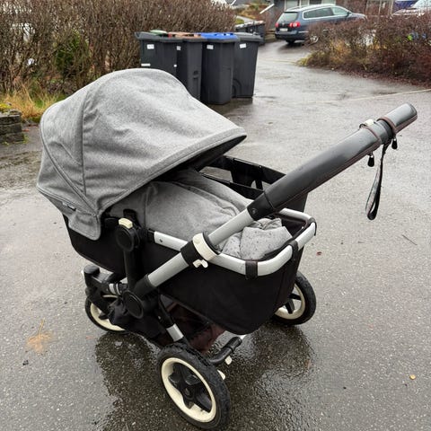 Bugaboo donkey tvilling/søskenvogn selges. Kalesjene er noe falmet, litt misfarging på ene hjulet og en dårlig låse hemp under når den er slått sammen som vanlig vogn,ikkje hatt noe å si for bruken. Se bilder.