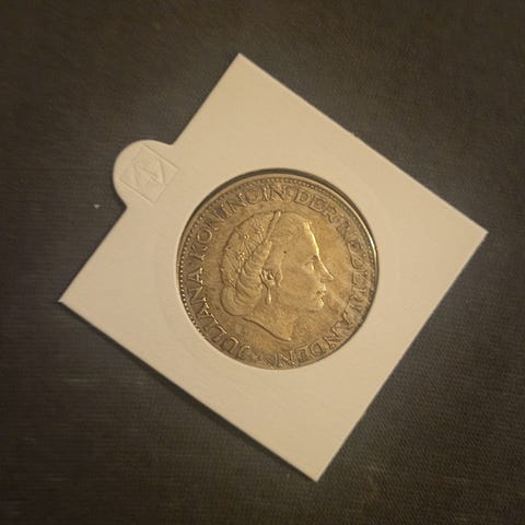 Nederland 1 Gulden mynt fra 1964 med motiv av dronning Juliana og riksvåpenet. Mynten er laget av sølvog viser årstallet 1964.