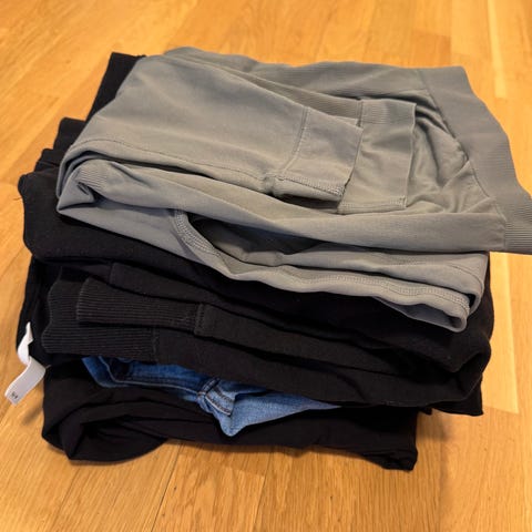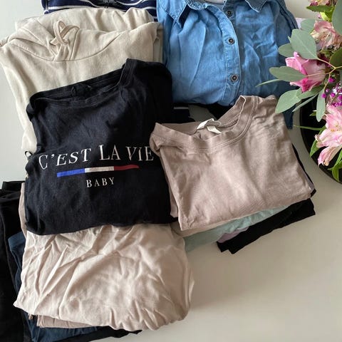 Fem shorts, seks t-skjorter, en genser og en kortermet kjole. Underdelene str L (40 - 42) og de fleste overdelene M, en L. Det meste fra HM. I god stand. Supergode basic gravidklær til vår/sommer.