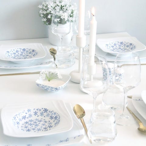 Inkluderer to middagstallerkener, en hjerteform, to frokosttallerkner og 4 kopper / krus.