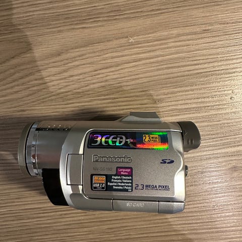 Panasonic PV-X10 videokamera i svart farge. En bærbar videokameraenhet med håndstropp og integrert søker. Leveres med lader og ekstra batteri.