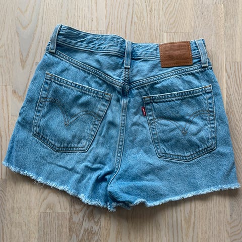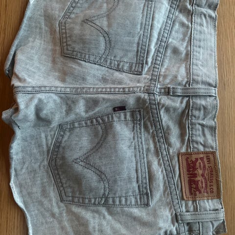 Pent brukt Levis dongerishorts. Str 28 i livet. Føler nok kanskje den er litt liten i størrelsen sammenlignet med en Levi's dongeribukse jeg har i samme størrelse.