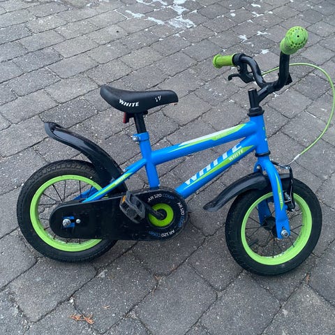 Merida barnesykkel med 12" hjul, rosa farge, utstyrt med 1 støttehjul og hvit kurv som mangler 1 feste. Mangler også håndtak isolering som vist på bilder. Sykkelen har sete med polstring og håndbrems, egnet for barn.