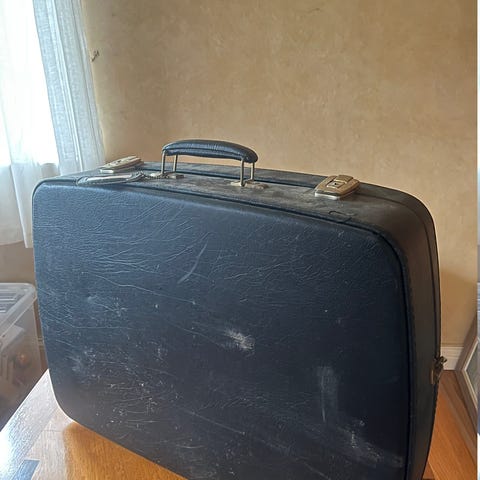 Selger en stor vintage koffert stoff med 2 hjul som bare ligger i loftet. Nå rydder vi og har ikke plass. Selger billig da vi ikke har plass. Mål b 75cm og h 53 cm og dybde 24 cmGodt brukt men funker fint til å oppbevare ting . Sender ikke og levere ikke .må hentes I Fyllingsdalen