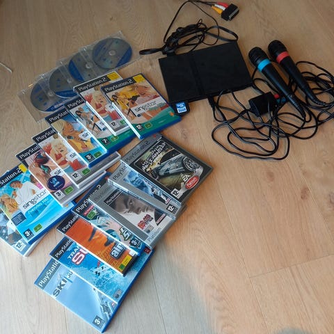 Playstation 3 spillkonsoll i svart farge med tilhørende kontroller, strømkabel og HDMI-kabel. Usikker på om kontrollen fortsatt fungerer, HDMI kabelen fungerer som regel men kan "falle ut" til tider.