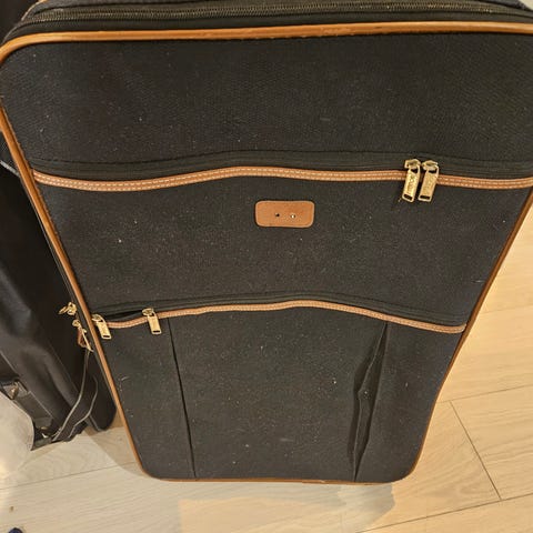 Selger en stoff koffert. Relativ stor med 2 hjull.merket Dunlop. Selger da vi holder på rydde og de blir ikke brukt. Mål h 77 og b 44 og dybde 22.selger i den tilstand den er. I gen skader. Sender ikke og levere ikke. Må hentes I Fyllingsdalen snarest