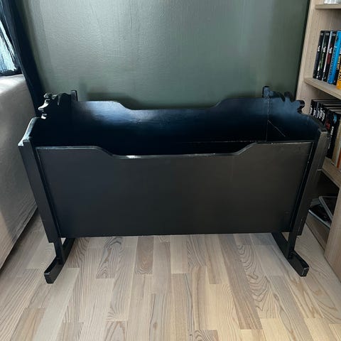 Vugge i tre (usikker på tresort) med grønnmalt finish. Passer for spedbarn.