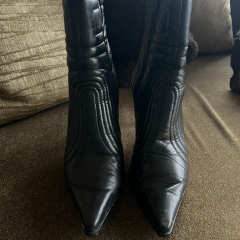 Supertøffe og spesielle støvletter selges etter et par gangers bruk da jeg ikke lenger har en rygg som tåler at jeg går i høye hæler. Nypris kr. 1400,- selges for kr 500 per par eller 1400 samlet for disse fortjener virkelig å vises frem. Ene paret er i vinrøde, andre paret er sorte med grønnskjær og siste er mørke grønne mønstret på de med liten hel. Disse er også videre i leggen og uten snøring men veldig fine detaljer.