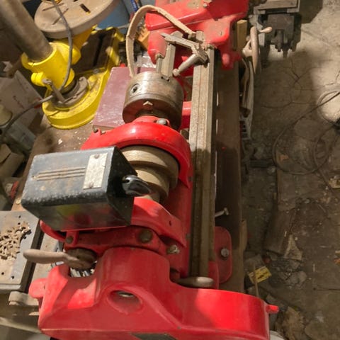 Det er en annen opplevelse og bruke denne i forhold til originalen. Den har en stillegående 24volt dc motor av meget god kvalitet med meget godt dreiemoment ved lavt turtall. Den styres trinnløst fra ekstern strømforsyning. Det er også montert en ekstra motor med sakte mating uavhengig av spindel turtall som gir et fint overflate resultat. Den kan også brukes ved å dreie kon da det ikke går med original mating. Spennhylsene er i mm men den delen som man fester hylsene med er dessverre borte. Får prøve og selge for selvkost som er kr.14000,-