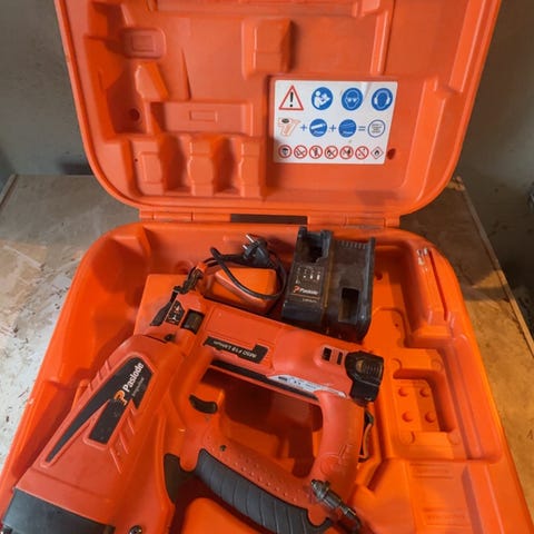 Paslode M65AF16 spikerpistol i oransje og svart farge. Leveres med batterilader, batterier, og ekstra spiker. Egnet for bruk innen bygg og snekring.