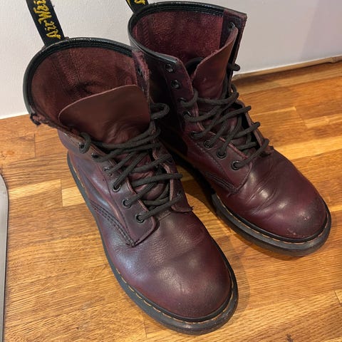 Dr. Martens støvler i størrelse 41, pent brukt. Støvlene har en nydelig Burgunder farge, lakk, og er laget av lær. De har snøring og en robust såle. Egnet for både hverdagsbruk og mer slitesterk i bruk. Kjøpt for flere år siden i Brussel, men var ikke i bruk i det siste. Kule, passer nesten til alt. Kun noen små bruksmerker.