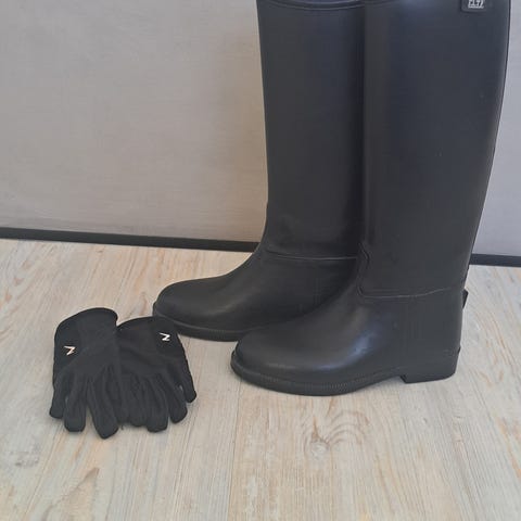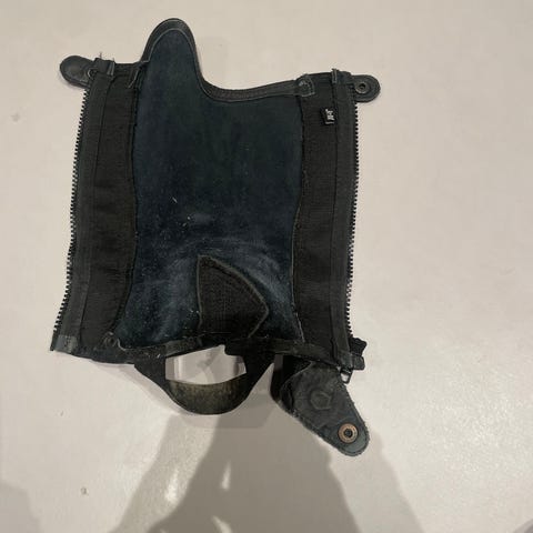 Junior ridestøvler chaps i størrelse 6-8 år, laget av svart skinn. Designet for barn, egnet til ridning og hestestell. Chapsene har justerbare stropper og knapper for sikker passform.