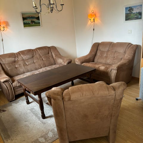 Antik pent brukt sofa og lenestoler i grønn velur.