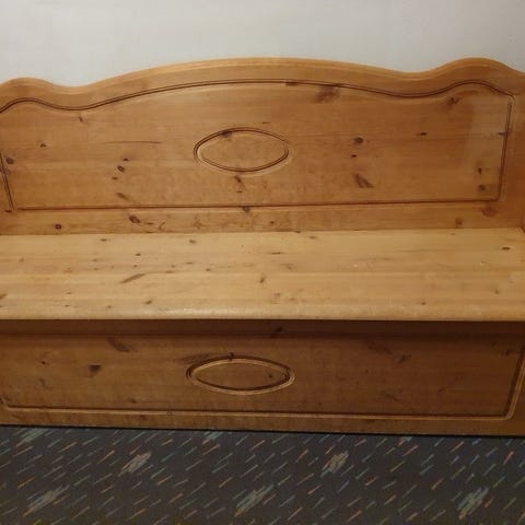 Skap med hyller og skuffer i furu. Må hentes