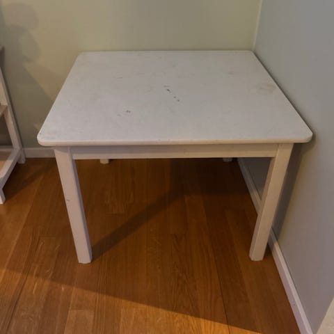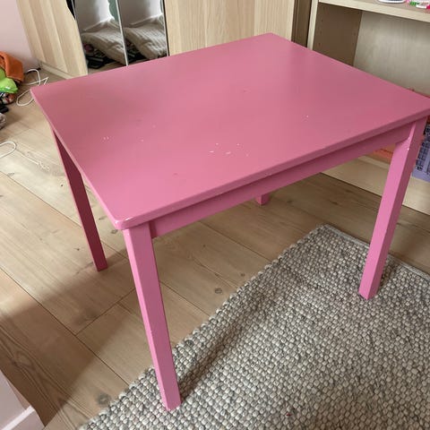 IKEA barneskrivebord med hvit bordplate og rosa ben. Passer for barn og kan brukes til lekser, tegning eller andre aktiviteter. Enkel og funksjonell design.