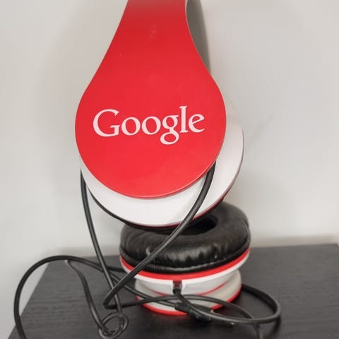 Google hodetelefoner trådløse, hvite. Leveres med ladeetui og ladekabel. Designet for trådløs bruk.
