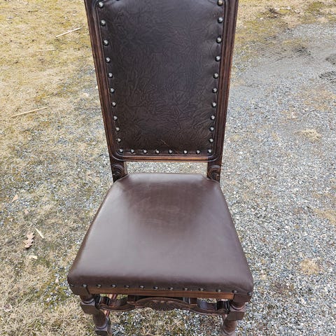 To brune pent brukte antikke skinnstoler med utskåret treverk. Stolene har polstret rygg og sete med knappdetaljer, og armlener med utskjæringer. Passer til bruk i stue eller spisestue.