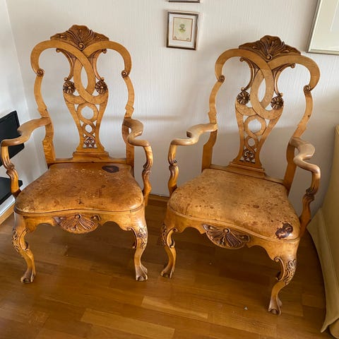 To brune antikke stoler/ skinnstoler med utskåret treverk