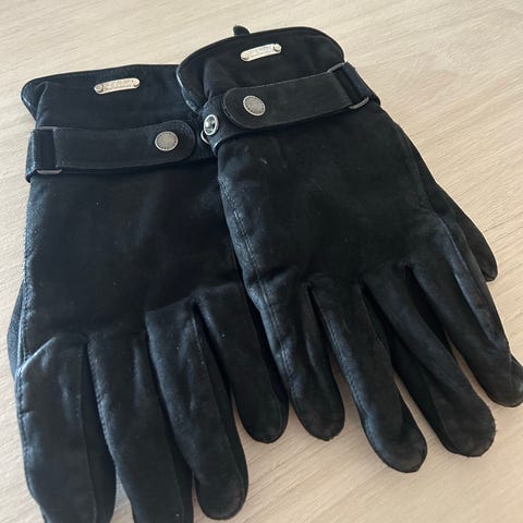 Mørke brune. Pent brukt. Forseggjort ved å kunne stramme dem med belte/ beltespenne.