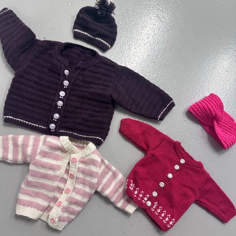 Hjemmestrikket jakke og bukse til nyfødt, pent brukt, men man kan se at det er brukt.