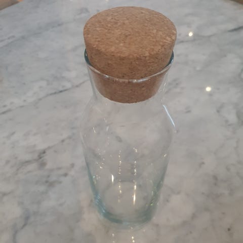 IKEA glassflasker med korklokk. Flaskene er laget av klart glass og har korklokk som tetning.