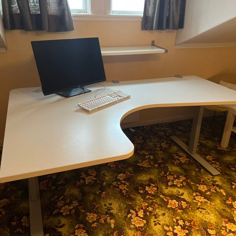 Skrivebord med hev/senk og bordplate i eike laminat fra 2025.