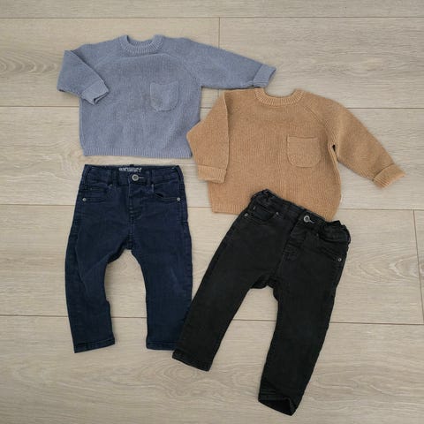 Newbie genser og Zara bukse for gutt i størrelse 86. Genseren er beige og har knapper på skulderen. Buksen er i denim-stil med elastisk midje.