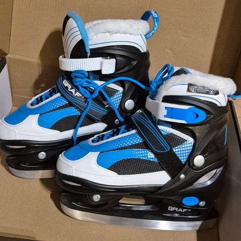 Supreme barneskøyte i størrelse 33, designet for ishockey. Skøytene er hvite med dekorative blomster, og har justerbare stropper for god passform. Egnet for barn som trener eller spiller ishockey.