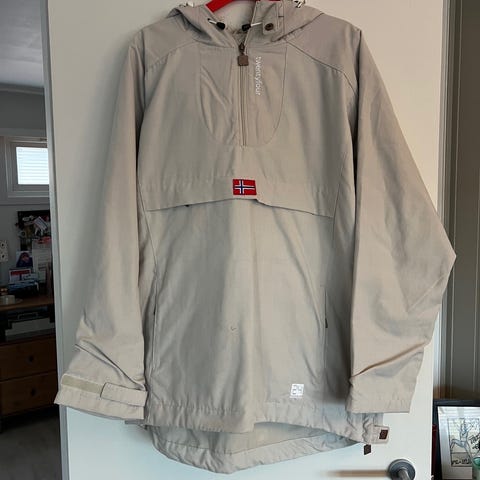 Pent brukt anorakk med "skinnkant" (kan taes av), 3 lommer, 2 glidelåser i halsen og 1 i siden. Merke Twentyfour Finse 1222.