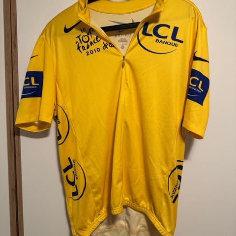 Replica Tour de France Polkadott/klatretrøye fra 2008 selges. Str. XL. Har noen små bruksmerker etter at blitt brukt på sykkeltur (se bilde). Må hentes, sender ikke.
