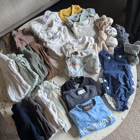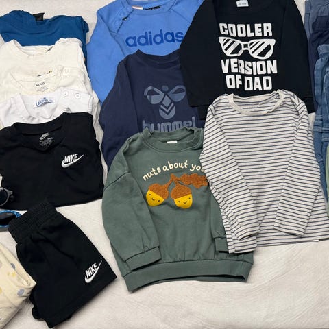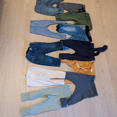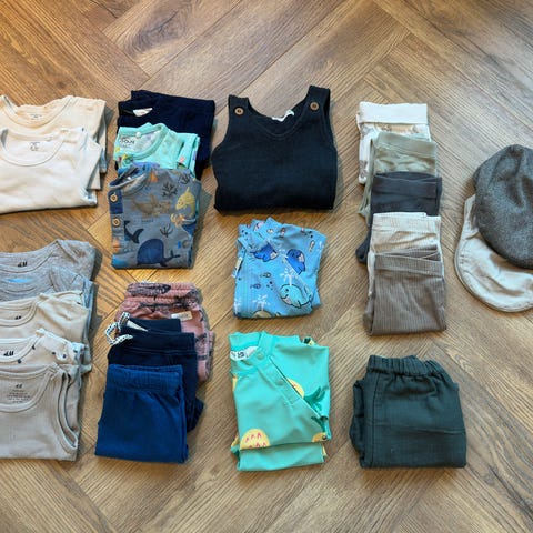 Barneklær for gutt i størrelse 74 med flerfarget design. Inkluderer ulike plagg i forskjellige farger og materialer, egnet for små barn.