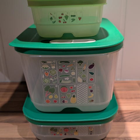 Plastboks med gjennomsiktig lokk og rist. Egnet for oppbevaring av matvarer. Laget i plastmateriale, firkantet form. Fungerer til kjøkkenbruk.