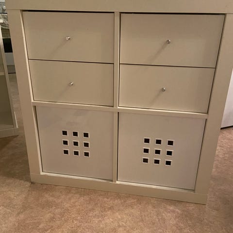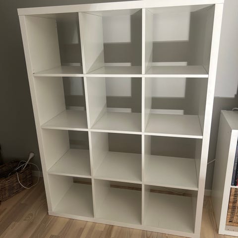 Kallax hylle fra IKEA, flere synlige bruksmerker, men mye bruk igjen :)
