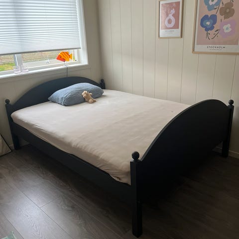 Sengen er i god stand, men har to mindre skader på en av trelamellene (se bilder). Dette påvirker ikke bruken nevneverdig og kan enkelt fikses av en litt handy person eller ved å bytte én lamell.