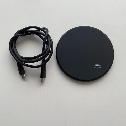 IDEAL OF SWEDEN ladere. En bærbar lader med kabel, designet for enkel lading av kompatible enheter. Har et rundt og et rektangulært ladeområde med ulike teksturer for stabil plassering av enheter.
