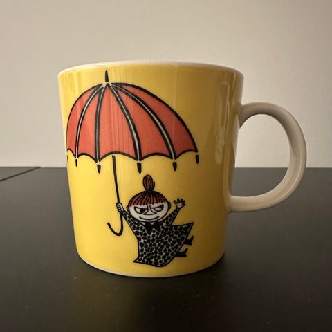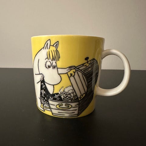 Arabia Mummikopp med figurmotiv i keramisk materiale. Koppen har et fargerikt design med karakterer fra Mummitrollet-serien.