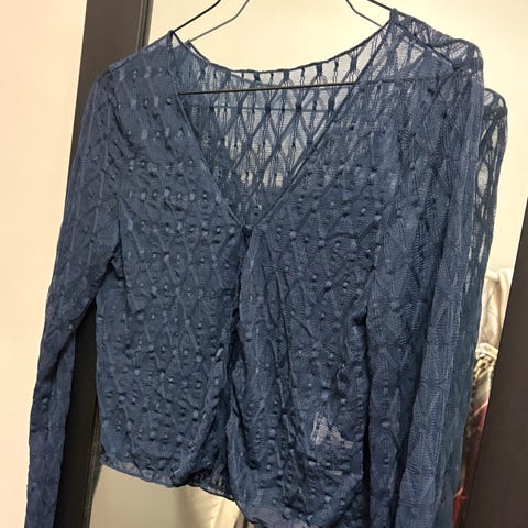 Dette er en nydelig T-skjorte/bluse i denim style/farge, med heklete blonder i fronten. Den litt "urolige" stilen gjør den veldig anvendelig til de mange ulike denim bukse-fargene. Den er nesten litt gjennomsiktig på ermene og bak (se egne bilder), men undertøyet synes ikke. Kan ikke finne en lapp, men tror den er fra danske NÜ.