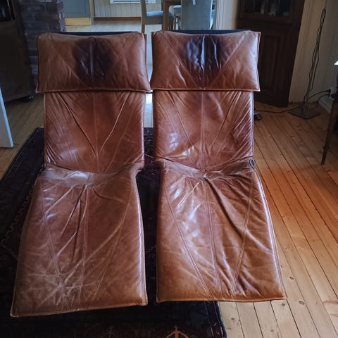 3 skinnstoler fra Hove Møbler, Skyline. Stolene er fra rundt 1970. Stolene er brukt, men er i god stand mtp at de er mellom 50 og 60 år gamle. Skinnputene er lette å ta av å tørke over / rense. Stolene selges for 3000 kr ( lav rygg)per stk. Den med høy rygg ( stol 3) selges for 3500. De to med lav rygg selges helst i par. Kjøpes alle tre samlet gir jeg et avslag på totalprisen.