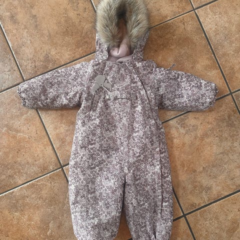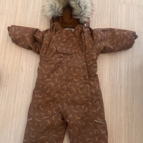 Vinterdress fra Wheat. Pelsen på hetta kan tas av. To originale fotstrikker