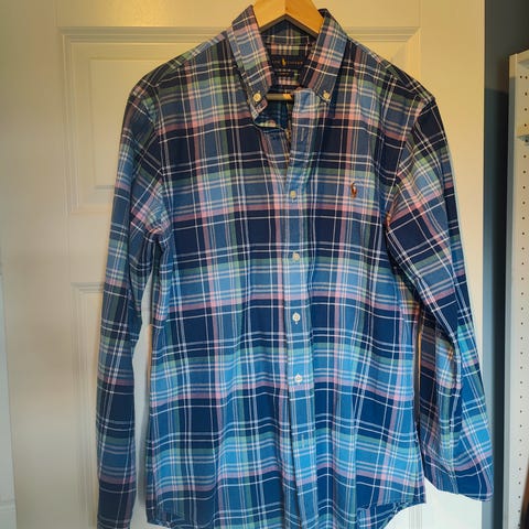 Ralph Lauren skjorte i blått med hvite striper, størrelse M for herre. Laget av bomullsmateriale. Passer til hverdags- og formelle anledninger.