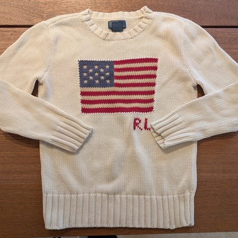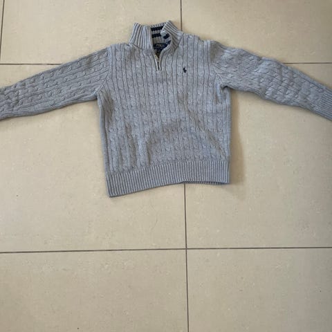 Ralph Lauren Polo genser i størrelse L (14-16). Strikket genser laget av fin bomull og har en grå farge med klassisk flaggmotiv på brystet og ribbestrikkede kanter ved ermer og nederkant.