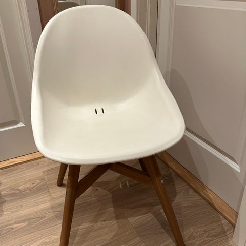 IKEA spisestoler i hvit og svart med ben i metall. Settet inkluderer fire stoler med et enkelt og funksjonelt design. Stolene har en lett konstruksjon og kan stables for enkel oppbevaring. Den svarte stolen følger med gratis.