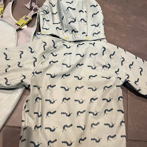 Mangler strikken under beina, samt buksen har noen riper i baken ,avbildet. Vil si det ikke er noe problem å sette en lapp på. Tatt mange bilder for å vise plagget stand. Ikke vasket så mye sand og misfarging på bildene, av erfaring går ikke bestandig alt dette vekk i vaks.