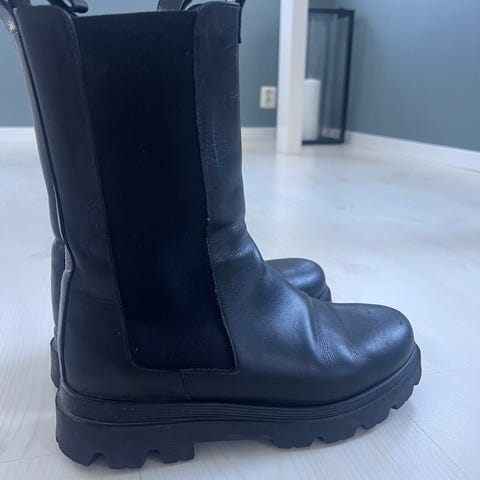 Selger noen pent brukte skinnstøvletter. De er fôret med ull, har stretch rundt leggen og god såle som ikke sklir.