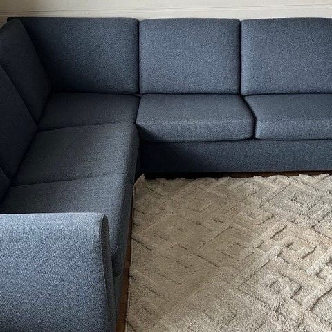 Sovesofa og lenestol med bord i blått stoff og hvit ramme