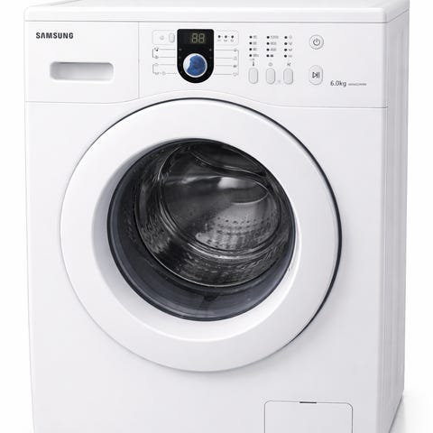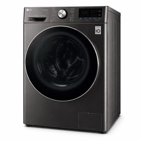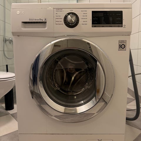 LG Frontmatet vaskemaskin med frontåpning. Maskinen er designet for effektiv klesvask med enkel tilgang gjennom frontdøren.